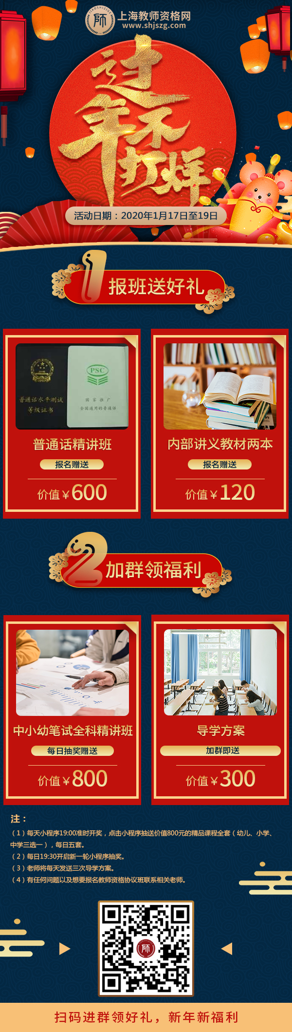 2020年庚子鼠年来临之际,上海教师资格网学习中心为了回馈各位,准备了丰厚的优惠活动和超值的抽奖大礼包。