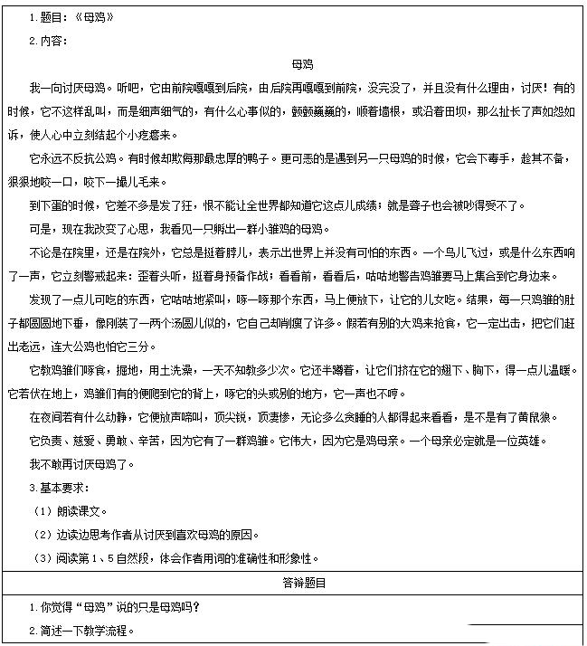 这堂课主要有五个教学环节。首先是导入新课,联系学生对母鸡的认识导入新课,激发学生的学习兴趣。第二个环节是初读课文,整体感知,在这个环节主要解决生字词,梳理出作者的情感变化。第三个环节是深入研读,体会作者情感,引导学生反复朗读,在朗读中圈点勾画,抓住关键词赏析语言,体会情感。第四个环节是深化中心,拓展延伸,引导学生认识到母爱的伟大。最后我留了课后作业,对比阅读本文与《猫》的写法上异同。