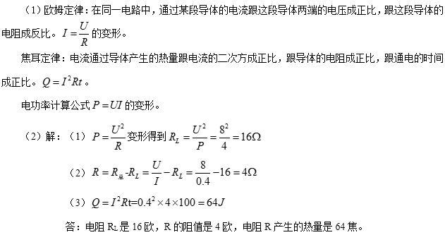 (1)焦耳定律:电流通过导体产生的热量跟电流的二次方成正比,跟导体的电阻成正比,跟通电时间成正比。这个规律叫做焦耳定律。