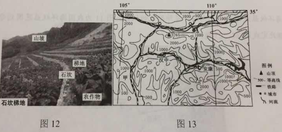 28、……材料分析1:比较图13中甲乙两地种植柑橘的区位条件(10分)材料分析2:说明石坎梯地对于农业生产的作用(6分)