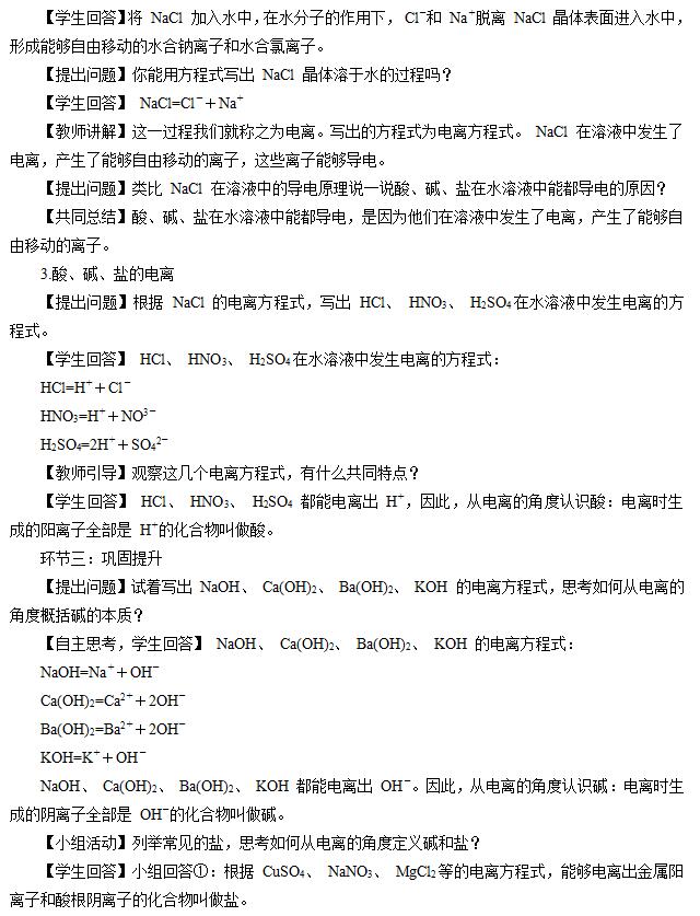 【提出问题】不仅它们的溶液能够导电,它们的固体分别加热至熔化也能导电。今天我们先来研究为什么氯化钠溶液能够导电的问题,一起来学习“酸、碱、盐在水溶液中的电离”。