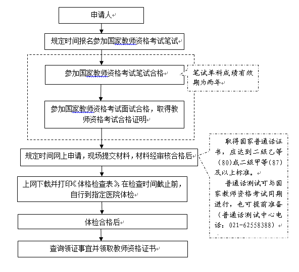 (1)办理环节:申请人通过网上申请,现场提交申请材料,上海市宝山区教育局组织专人对申请人所交材料进行当面审核,对于提供申请材料齐全、符合规定条件,经审核合格的,上海市宝山区教育局教师资格认定办公室提示其参加指定医院体检,经过体检合格后,将结果上报至上海市宝山区教育局,经上海市宝山区教育局审核后作出是否颁发教师资格证书的决定,并将教师资格证书或不予认定的通知送达申请人。