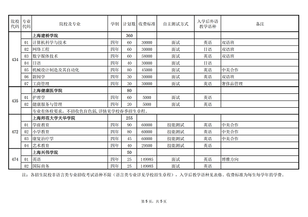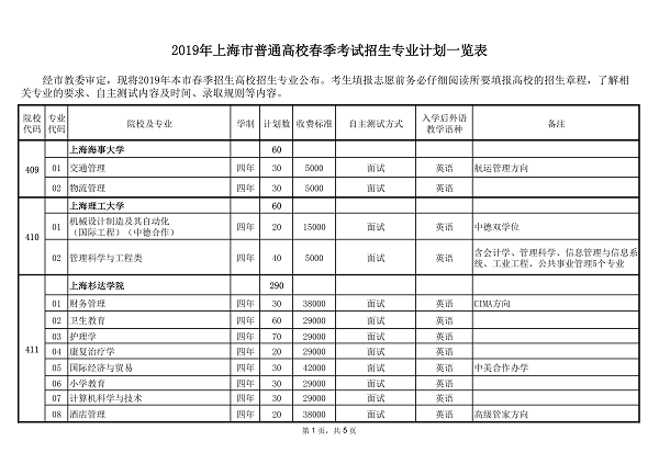 2019年上海市普通高校春季考试招生专业计划一览表