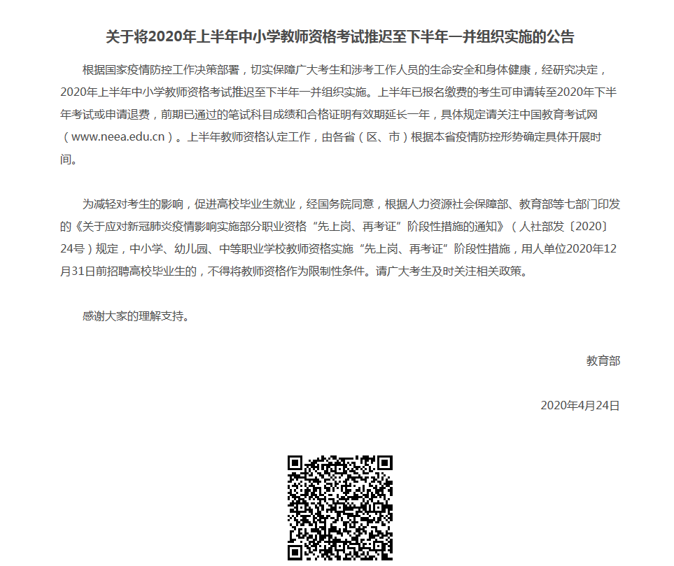 关于将2020年上半年中小学教师资格考试推迟至下半年一并组织实施的公告