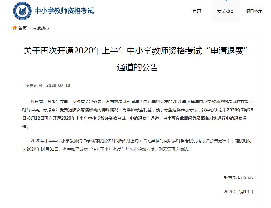 教育部考试中心:关于再次开通2020年上半年中小学教师资格考试“申请退费”通道的公告
