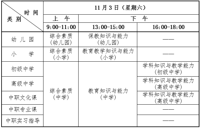 (一)2018年下半年中小学教师资格证考试笔试的考试时间为11月3日(星期六)。所有考试科目全部采用纸笔考试方式,每场考试时间为120分钟。具体安排见下表: